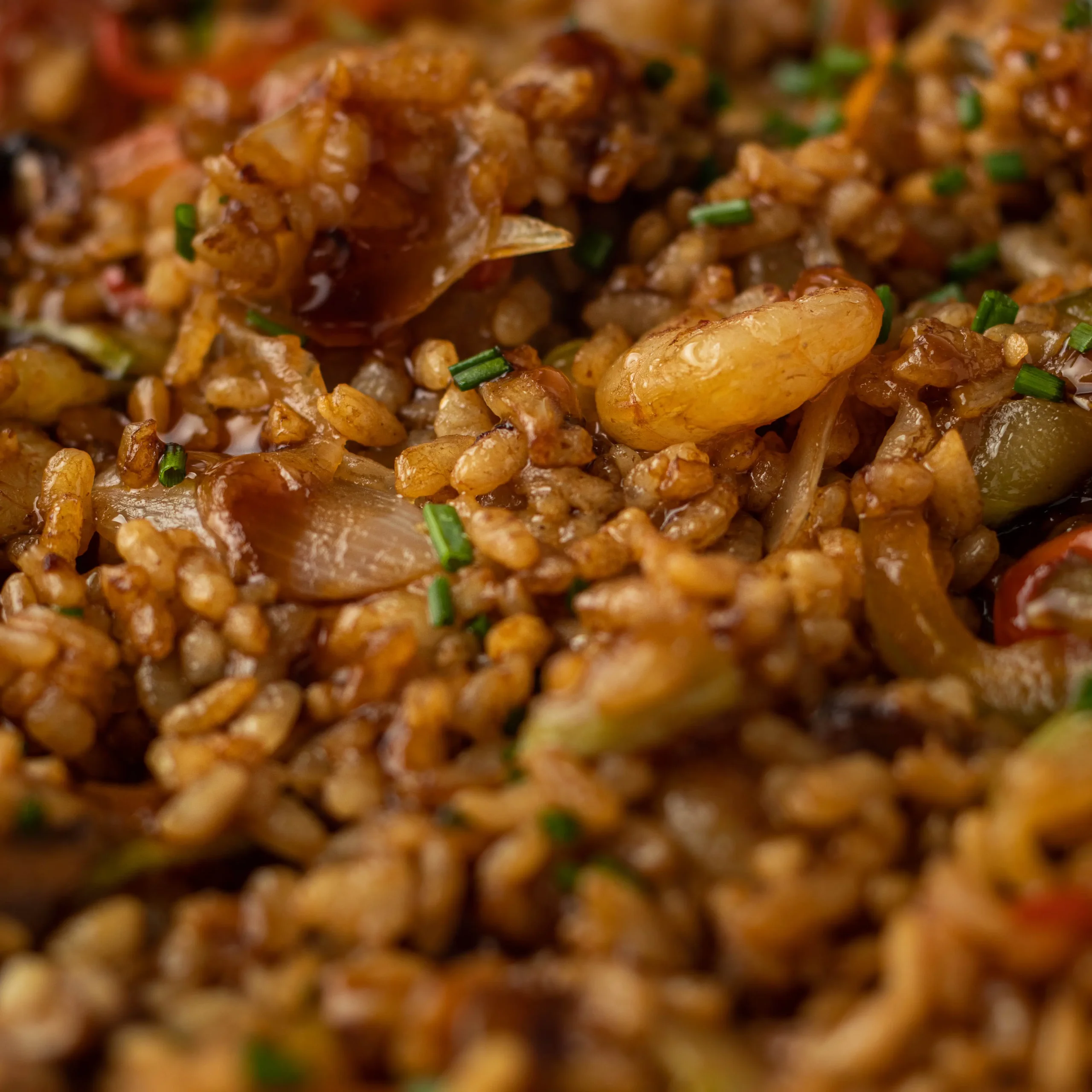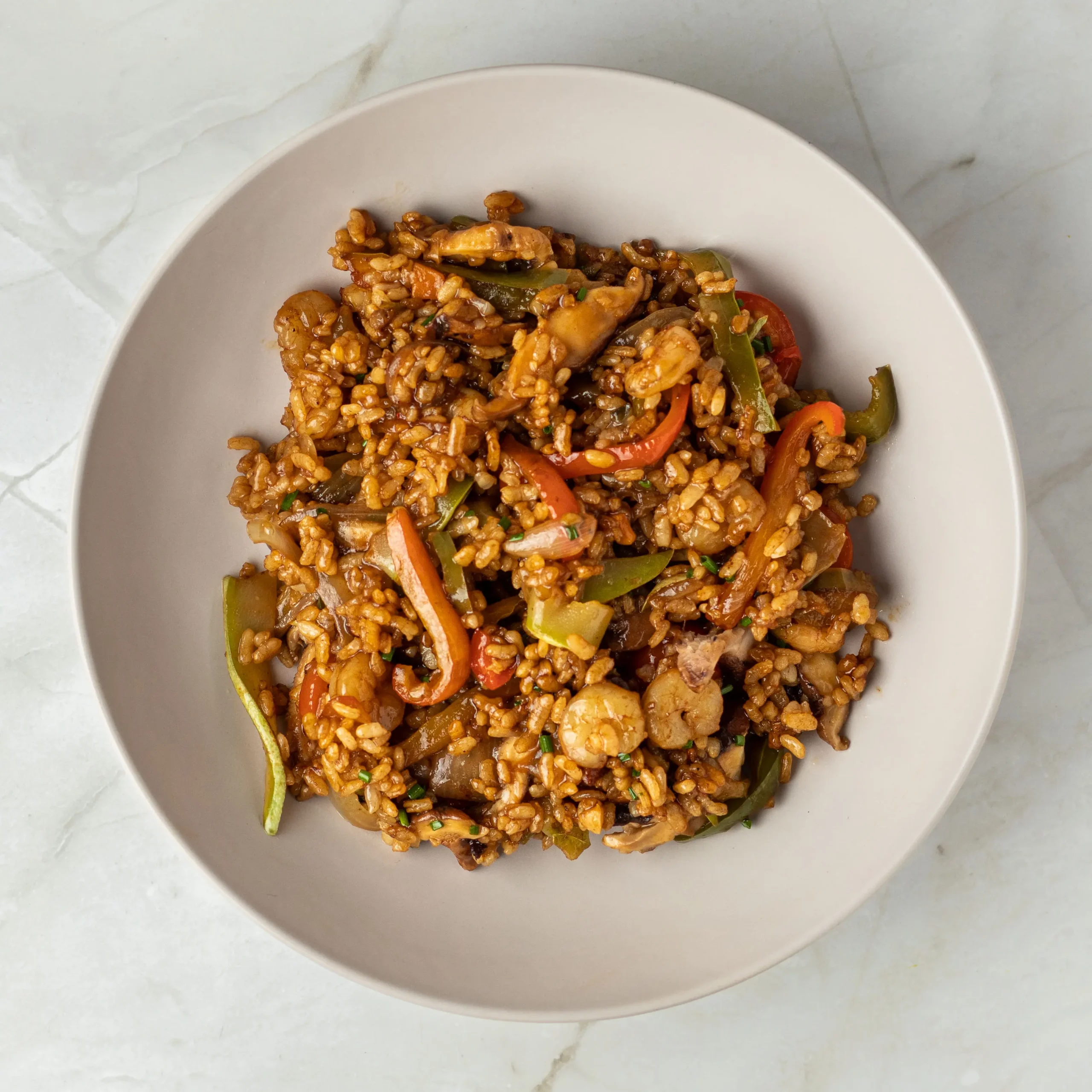 Arroz, pimiento verde, pimiento rojo, calabacín, cebolla, setas, soja, pimentón, langostinos, aceite de oliva y sal.