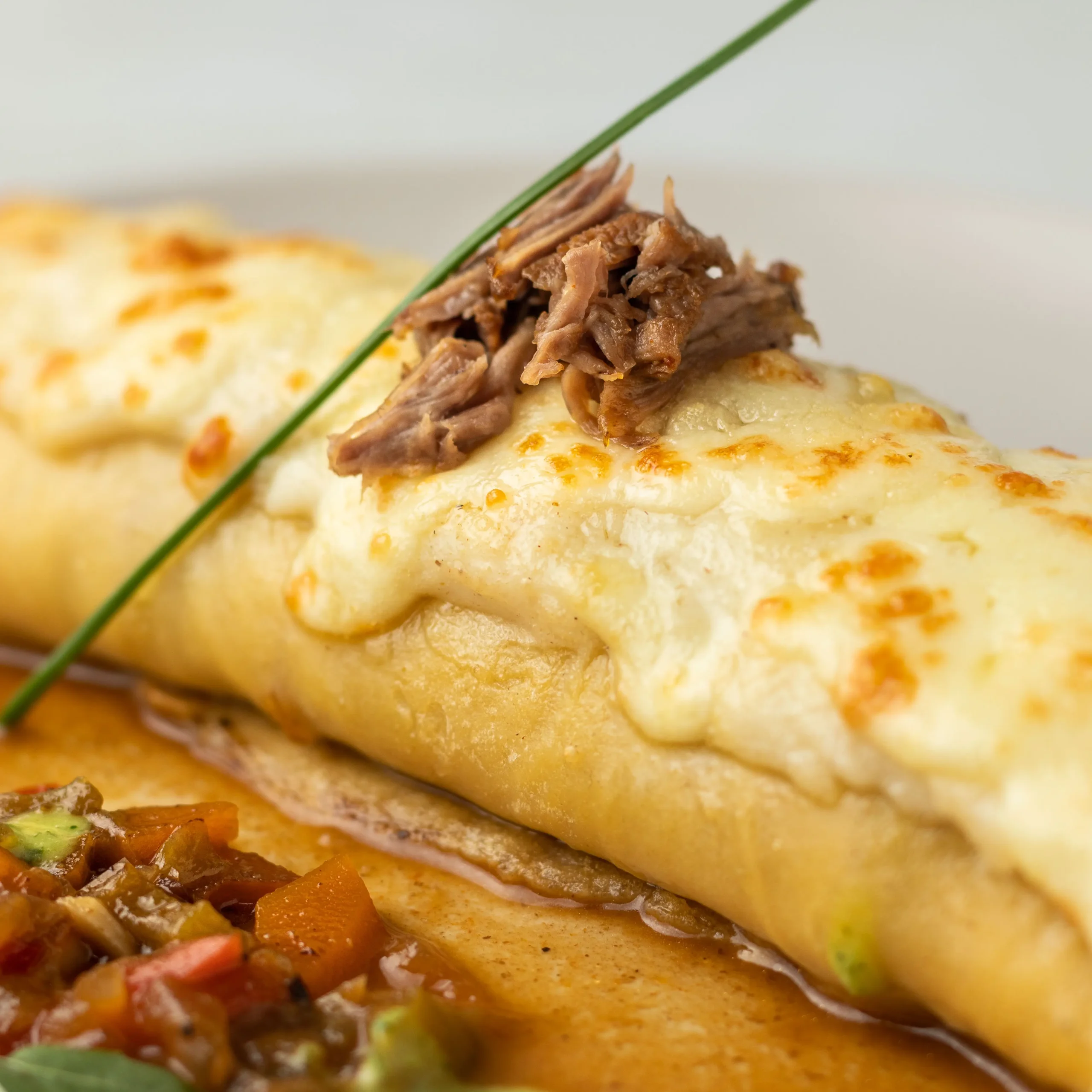 Carrillada, carne de cabeza de lomo, zanahoria, cebolla, ajo, tomate, vino tinto, pimiento, caldo de carne, harina, leche, queso parmesano, queso mozzarella, zanahoria, aceite de oliva y comino.