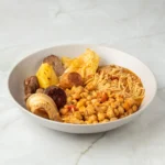 Garbanzos, cerdo, ternera, tocino, morcilla, chorizo, cebolla, zanahoria, col, patata, pimiento rojo, ajo, fideos, sal, comino, pimienta, ñora y aceite de oliva.