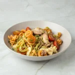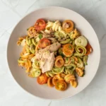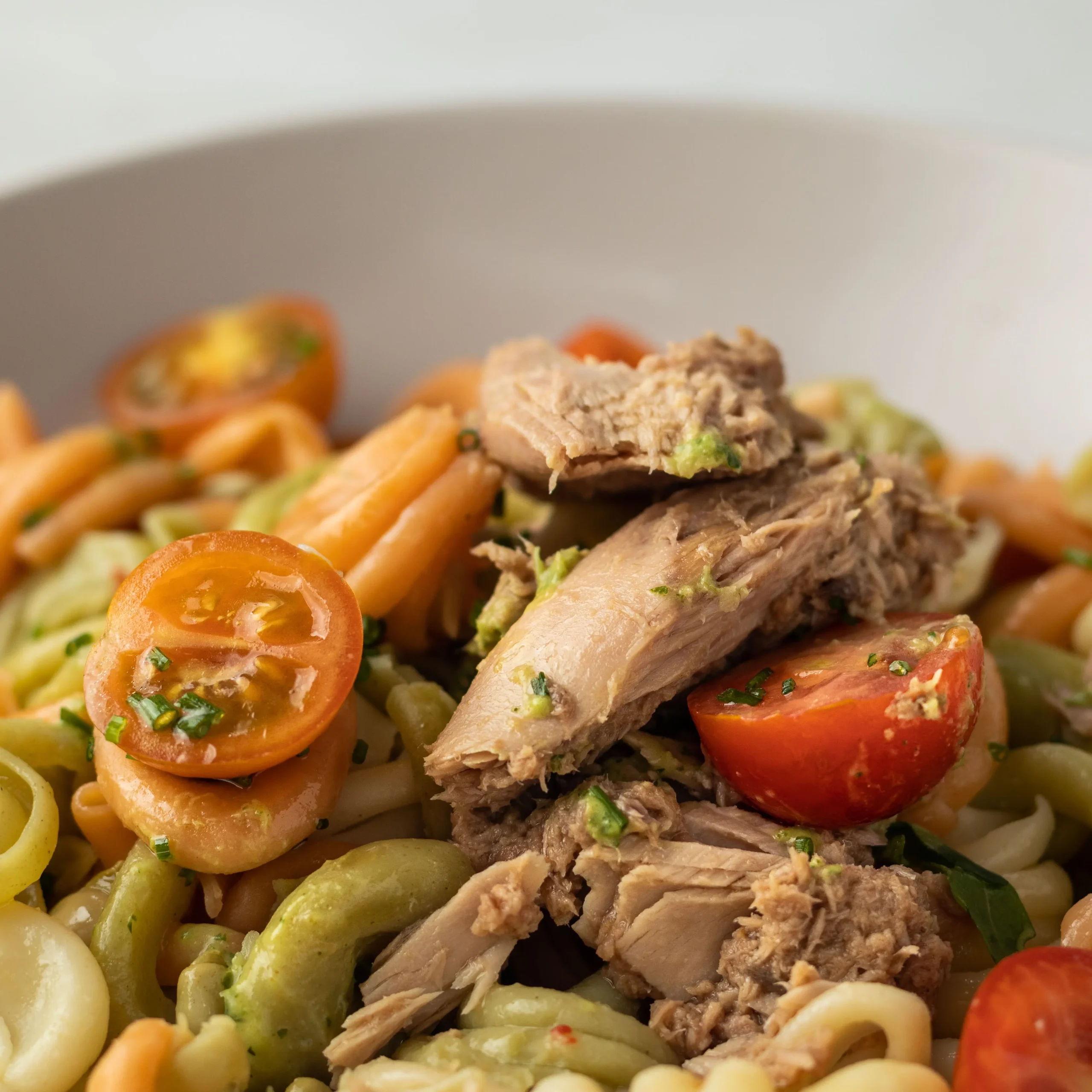 Espiral tricolor, maiz, huevo duro, cebolla, atún, vinagre, sal y aceite de oliva.