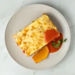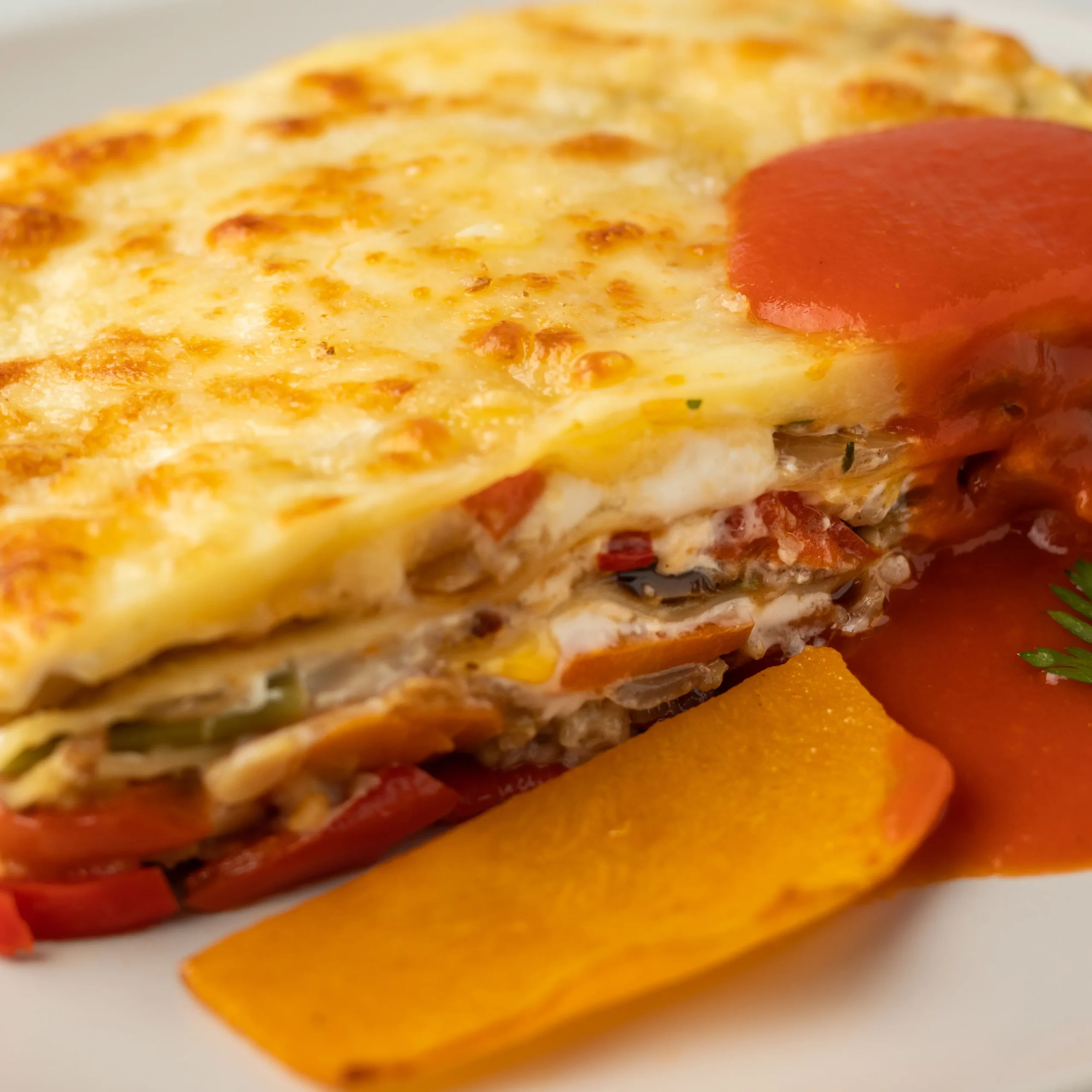 Setas, Pimiento rojo, pimiento verde, calabacín, zanahoria, berenjena, cebolla, puerro, ajo, aceite de oliva, calabaza, leche de soja, harina, pimienta, nuez moscada, tomate y queso vegano.