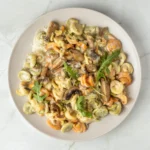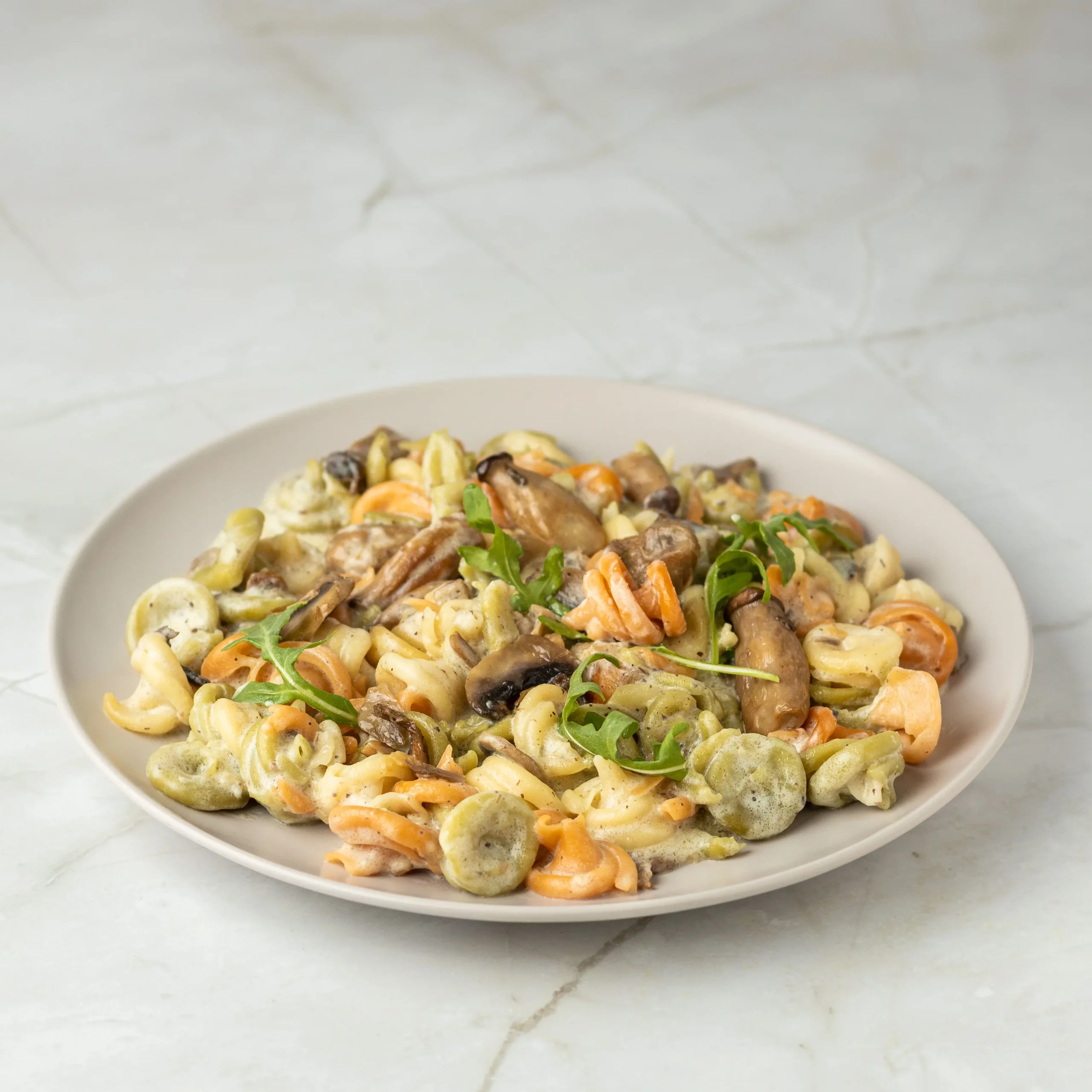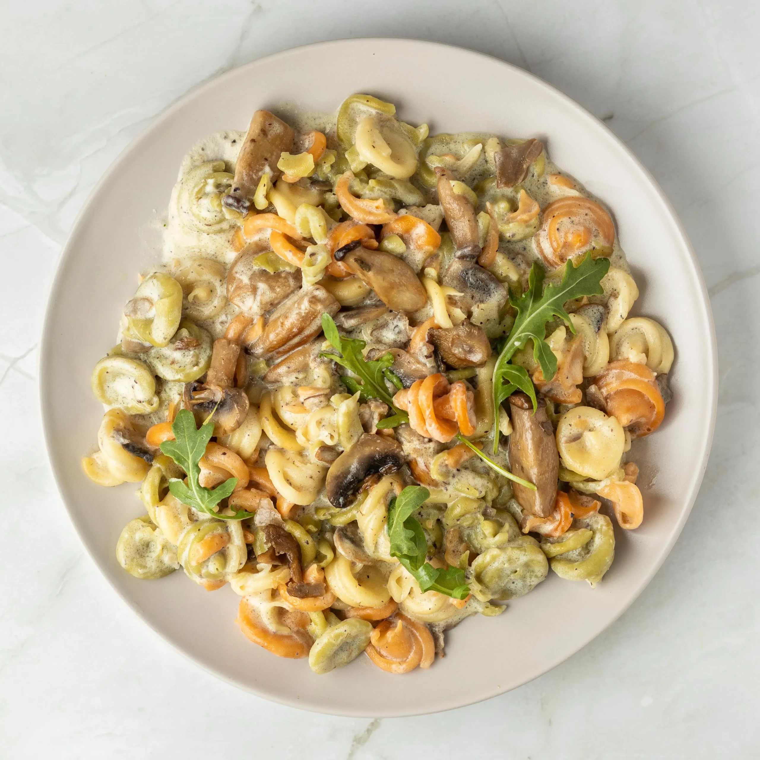Pasta, champiñones, queso vegano, cebolla, ajo, perejil, vino blanco, comino, sal y aceite de oliva.