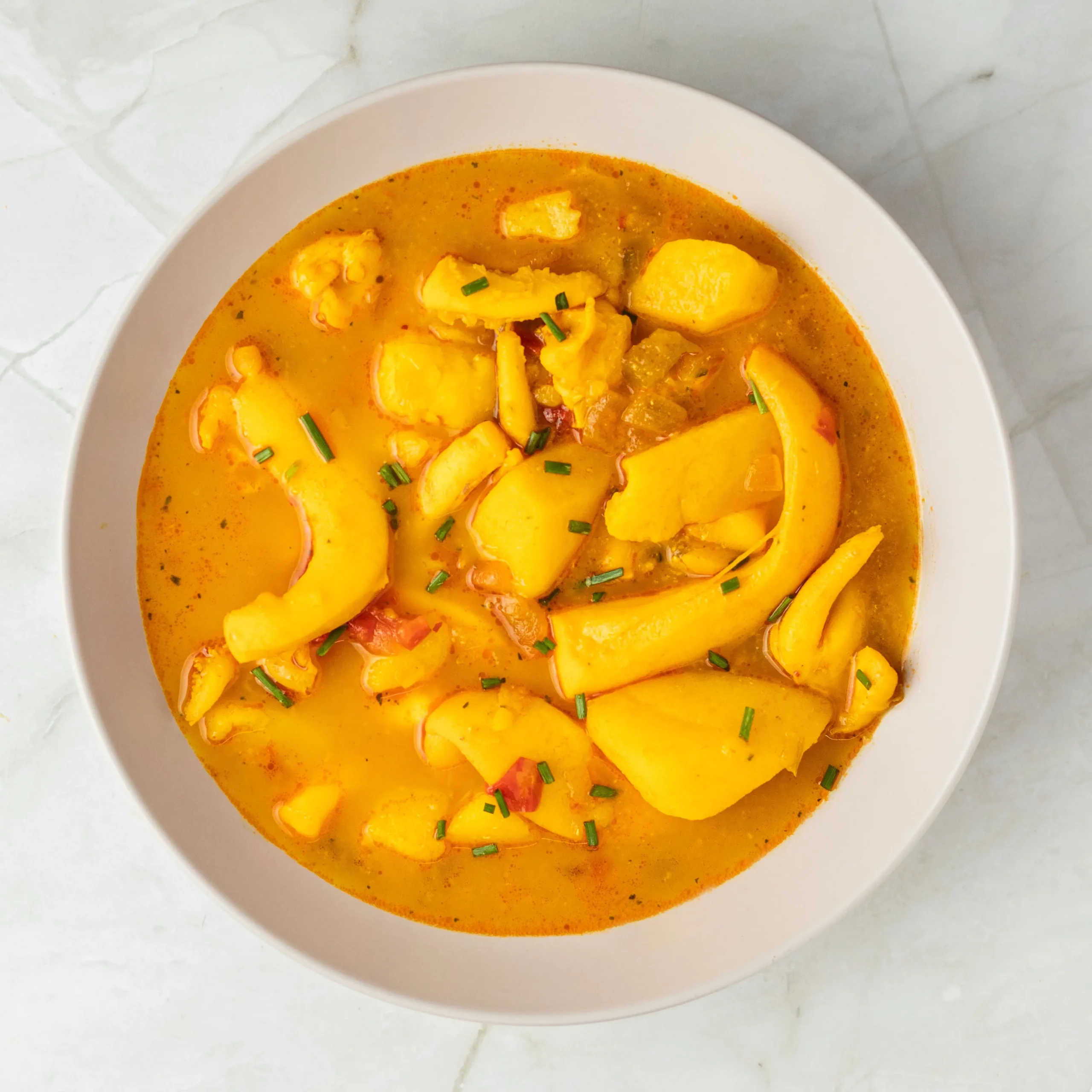 Patatas, cebolla, ajo, tomate, pimiento, pimentón, laurel, aceite de oliva, rabas, cúrcuma, azafrán, perejil y caldo de pescado.