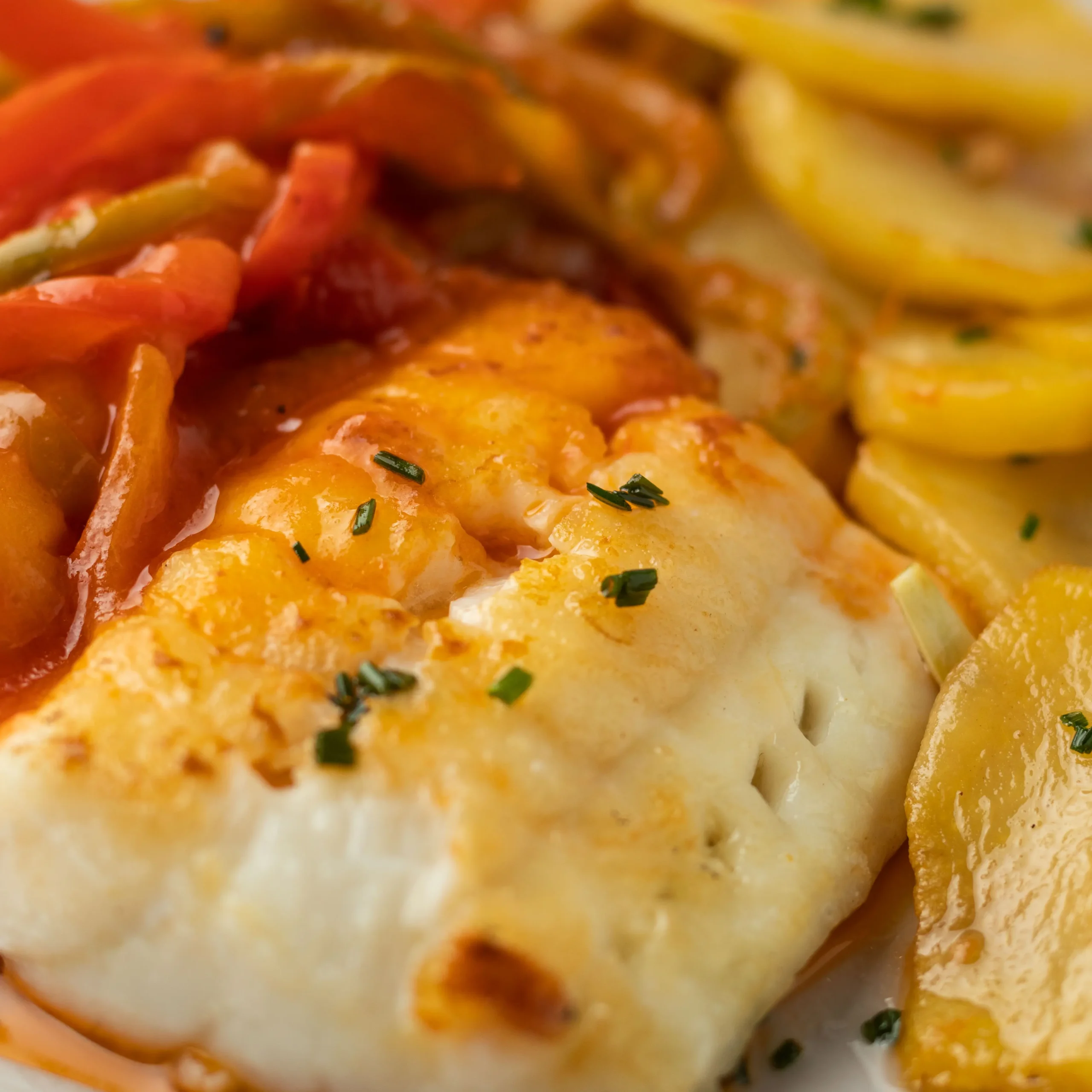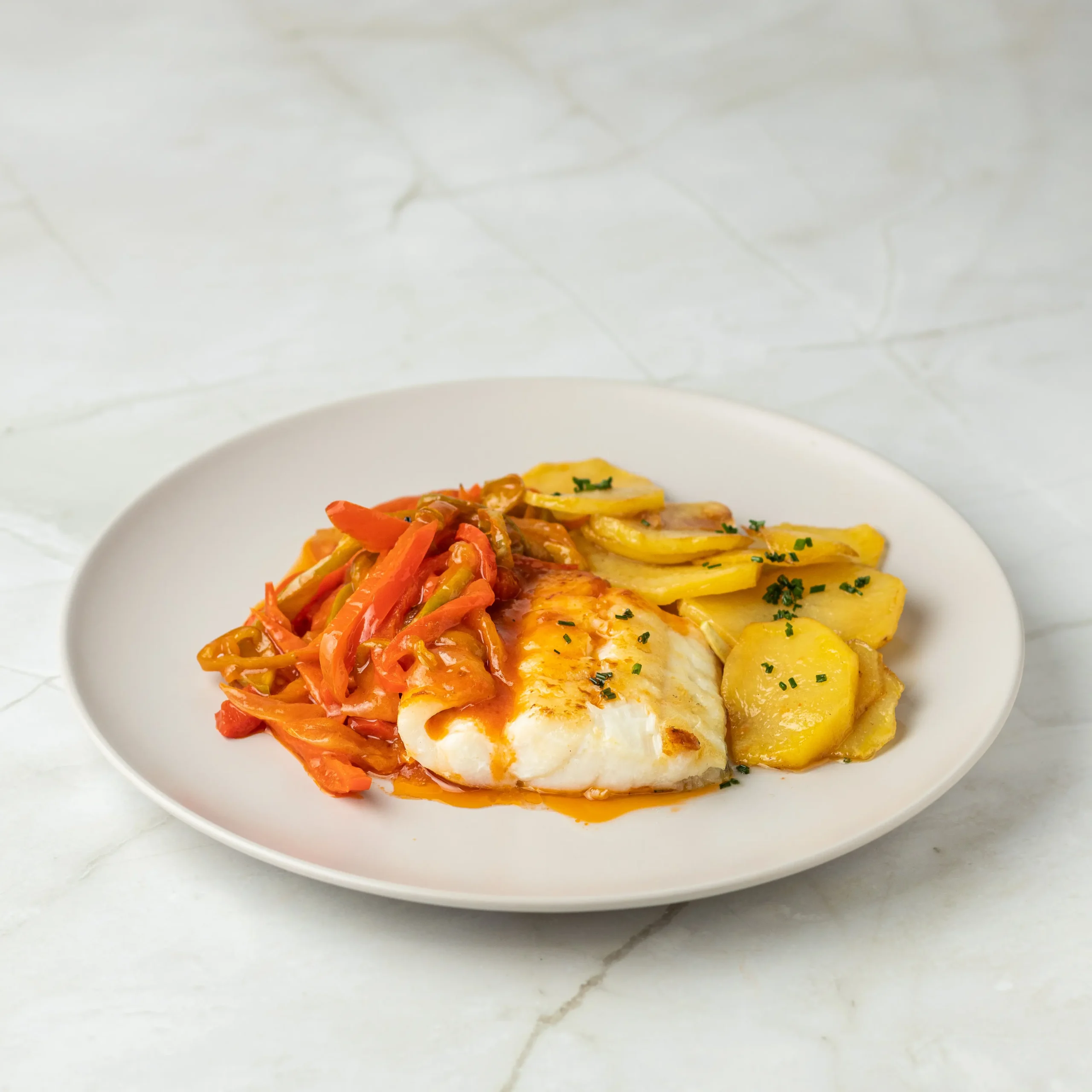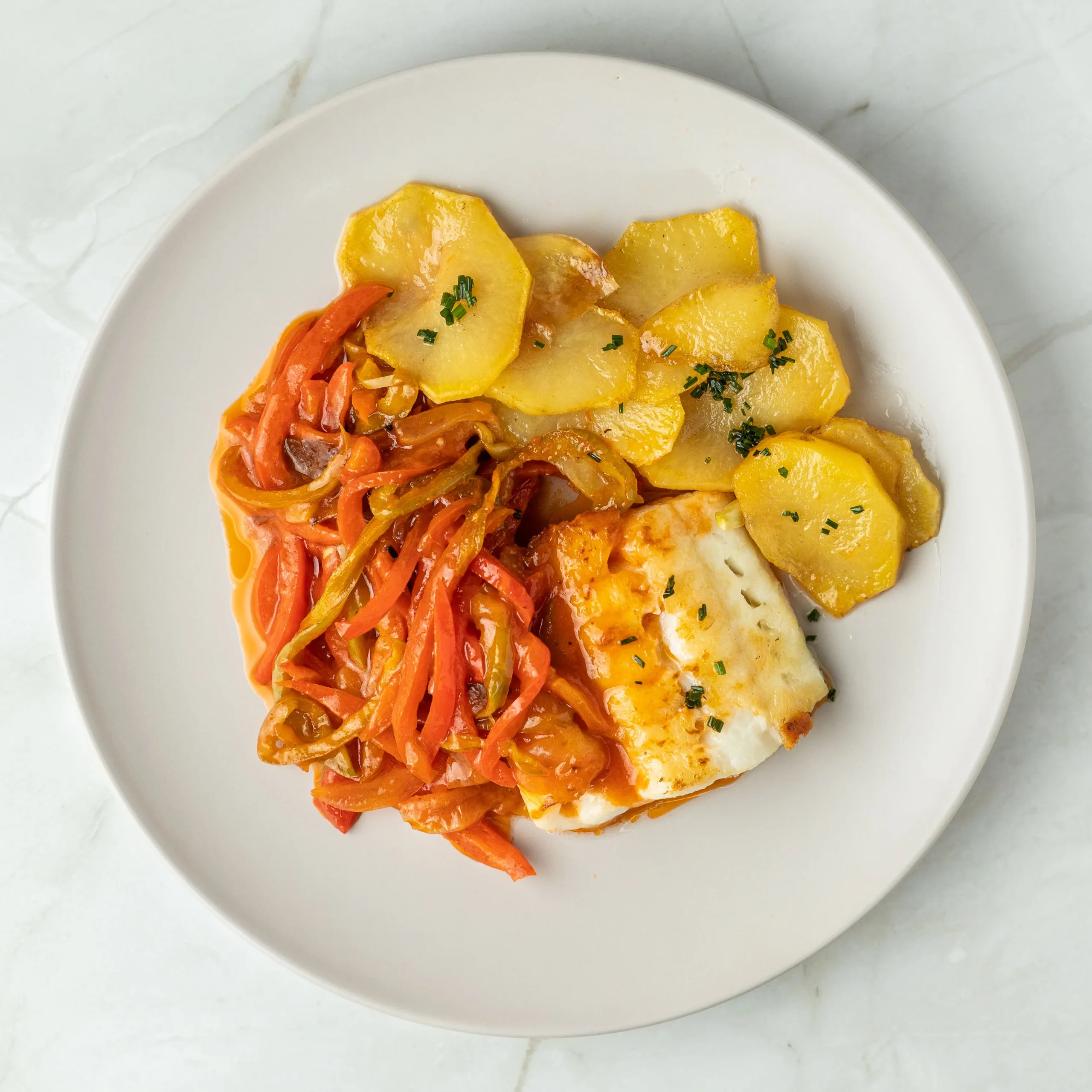 Rosada, pimiento rojo, pimiento verde, cebolla, ajo, tomate, laurel, patatas, vino blanco, pimentón, sal y aceite de oliva.