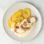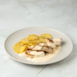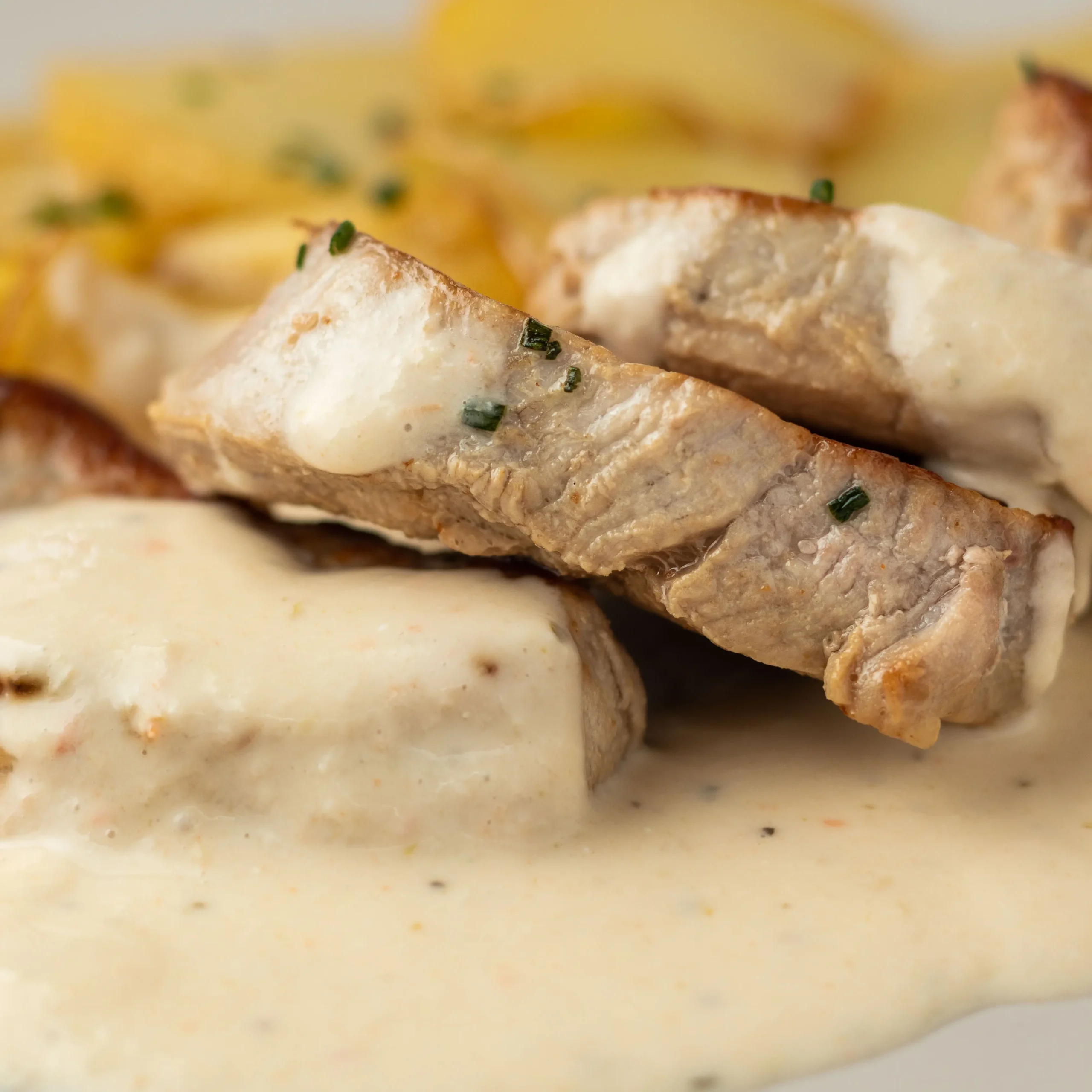 Solomillo, nata, roquefort, cebolla, pimienta, brandi, patatas, aceite de oliva y sal.