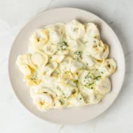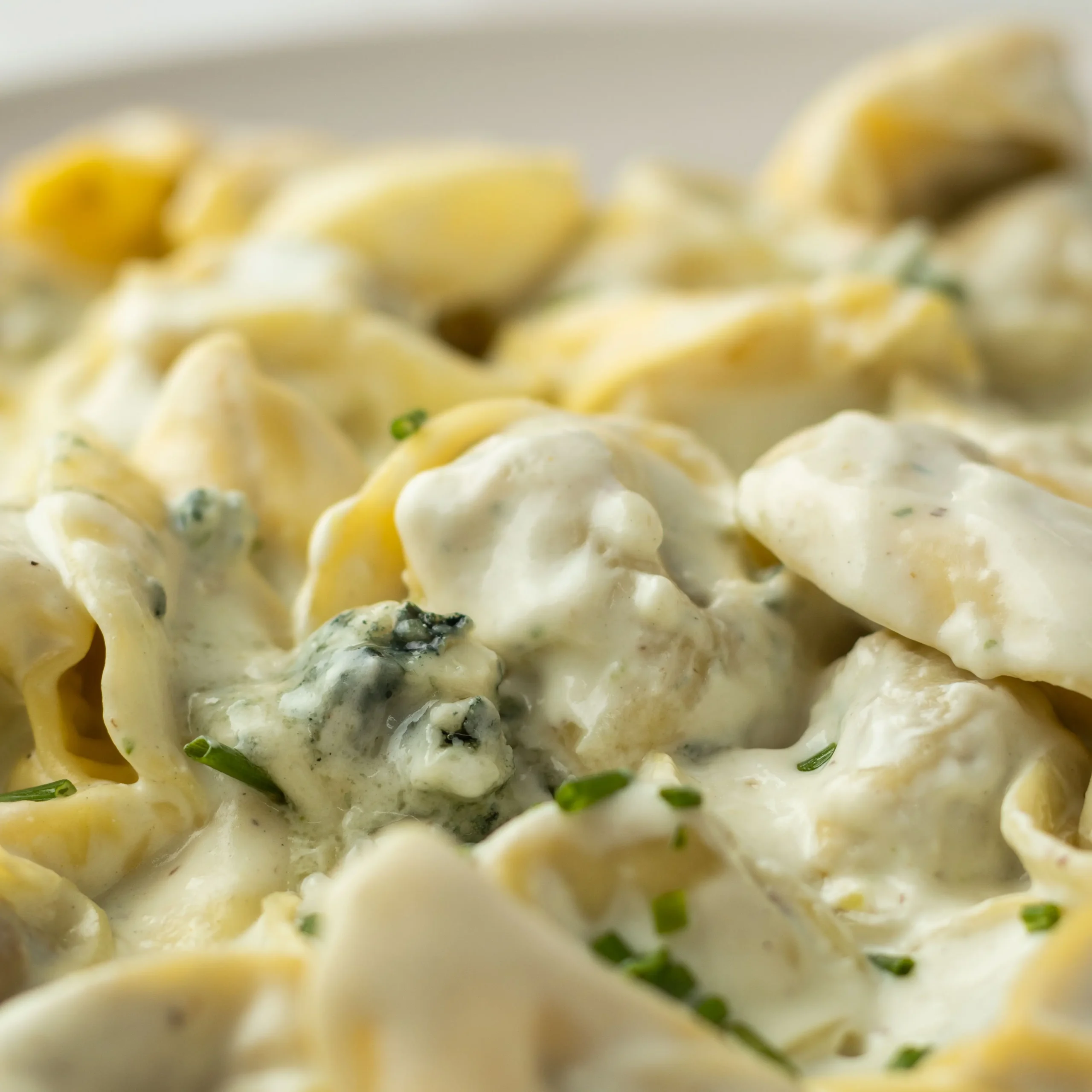 Tortellini, roquefort, brandy, nata, cebolla, mantequilla, aceite de oliva, ajo, pimienta y crema de queso.